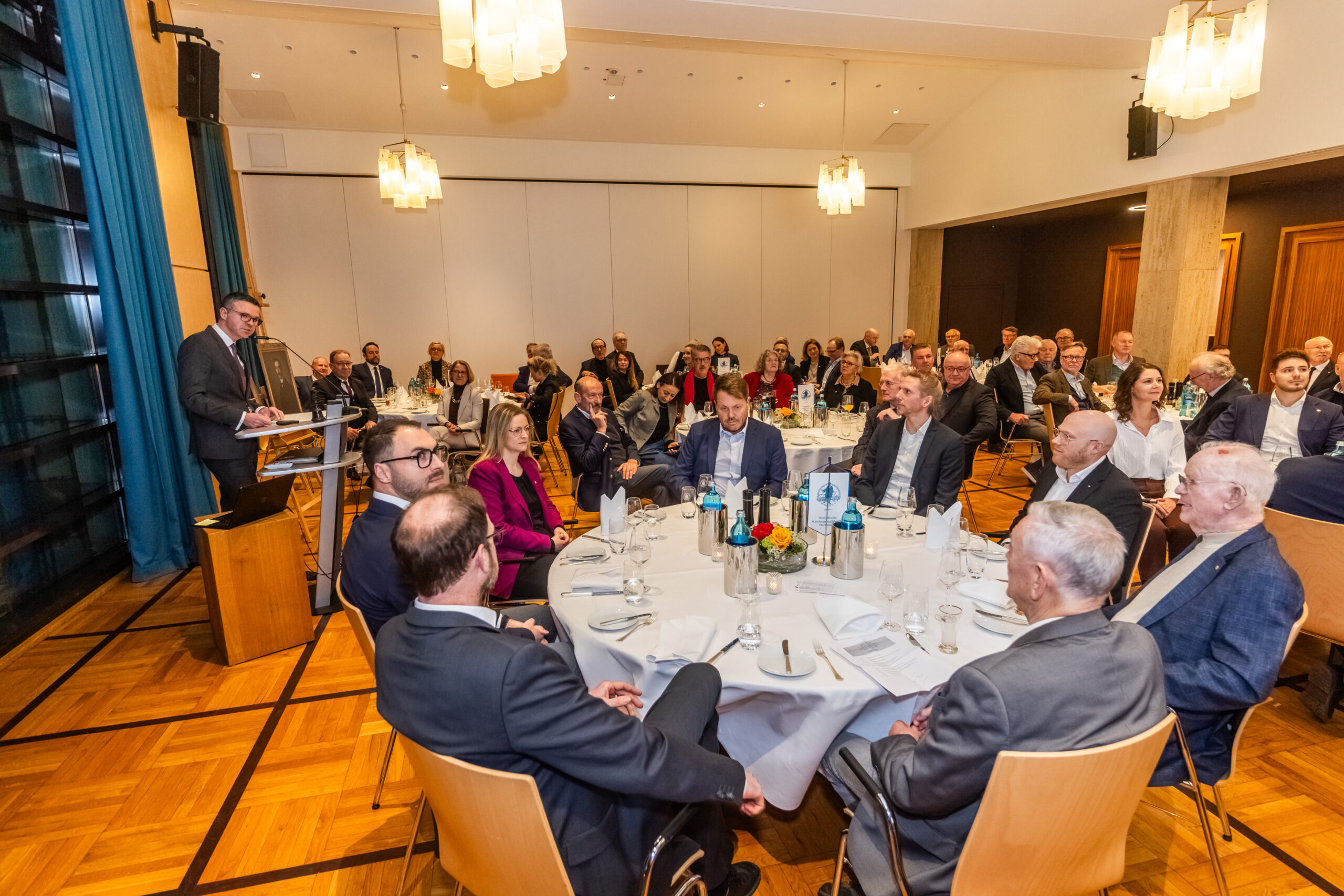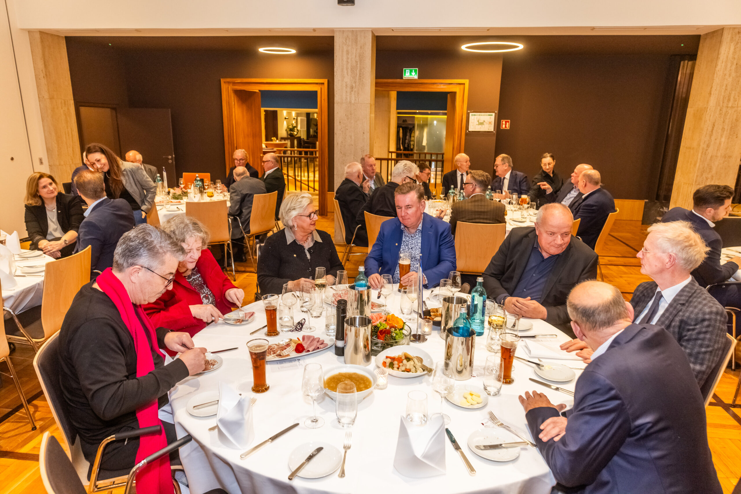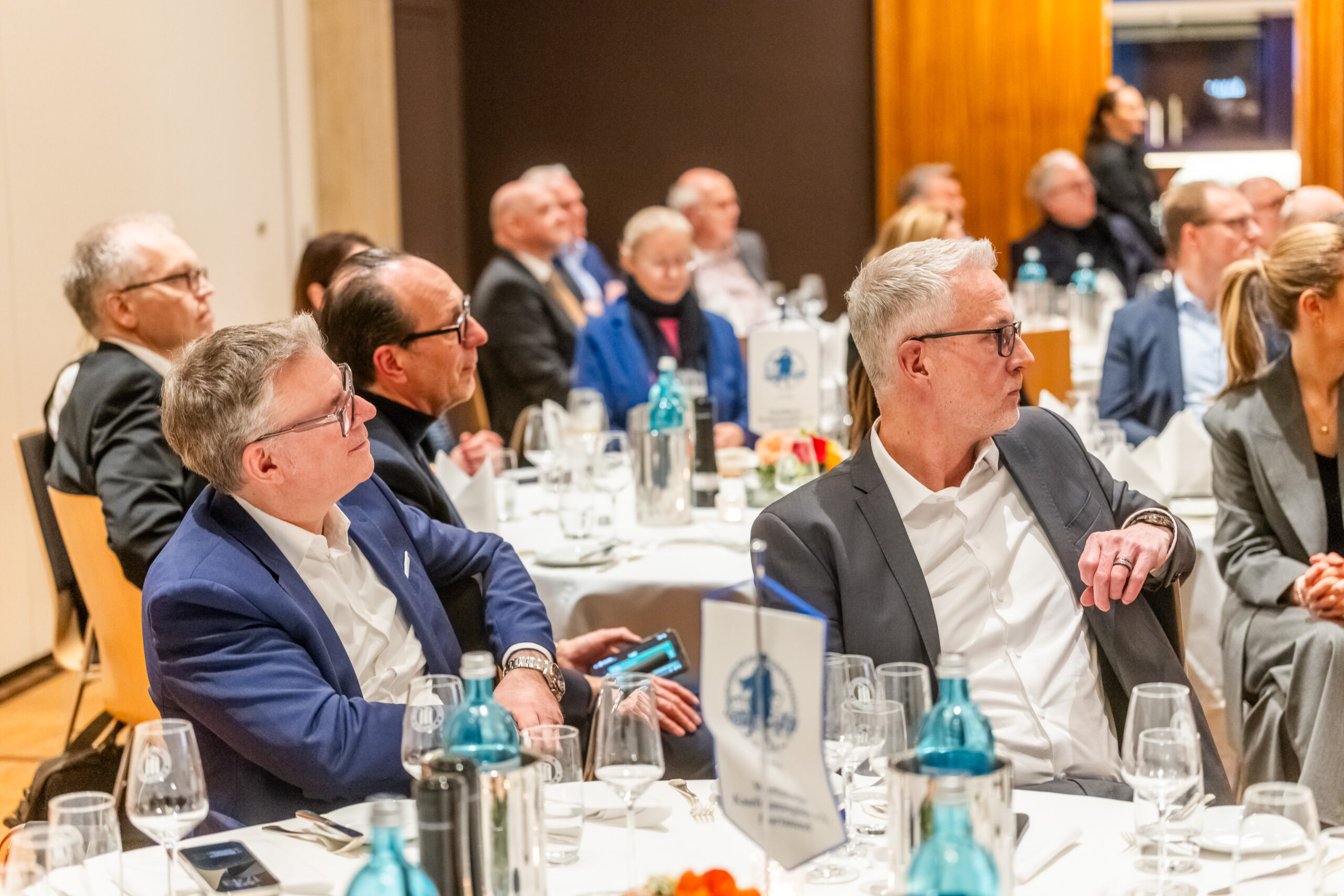 Zu Beginn des Abends blickte Jäger gemeinsam mit Kortmann und Lorenzen auf das vergangene Jahr zurück. Dieses sei sowohl auf internationaler als auch auf nationaler Ebene von Unsicherheiten und Umbrüchen geprägt gewesen, so der Leiter Unternehmenskommunikation bei der Dortmunder Volksbank. In seiner Ansprache ordnete Jäger zudem die aus seiner Sicht positiven wie auch herausfordernden wirtschaftlichen Entwicklungen für den Standort Dortmund ein, ließ die vergangenen zwölf Monate Revue passieren und gab den Anwesenden einen Ausblick auf das Jahr 2026.